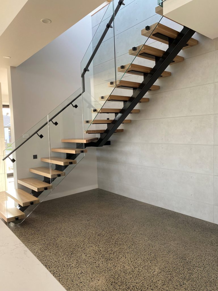 The project included extensive landscaping and drainage works, such as reinforced concrete sleeper retaining walls to the rear of the residence, precast reinforced concrete retaining walls along the street frontage, a large off-form concrete swimming pool and extensive timber-framed decks. The dwelling itself included a raft slab, strip footings and structural steelwork, with cantilevered stair treads and concealed downpipes.
